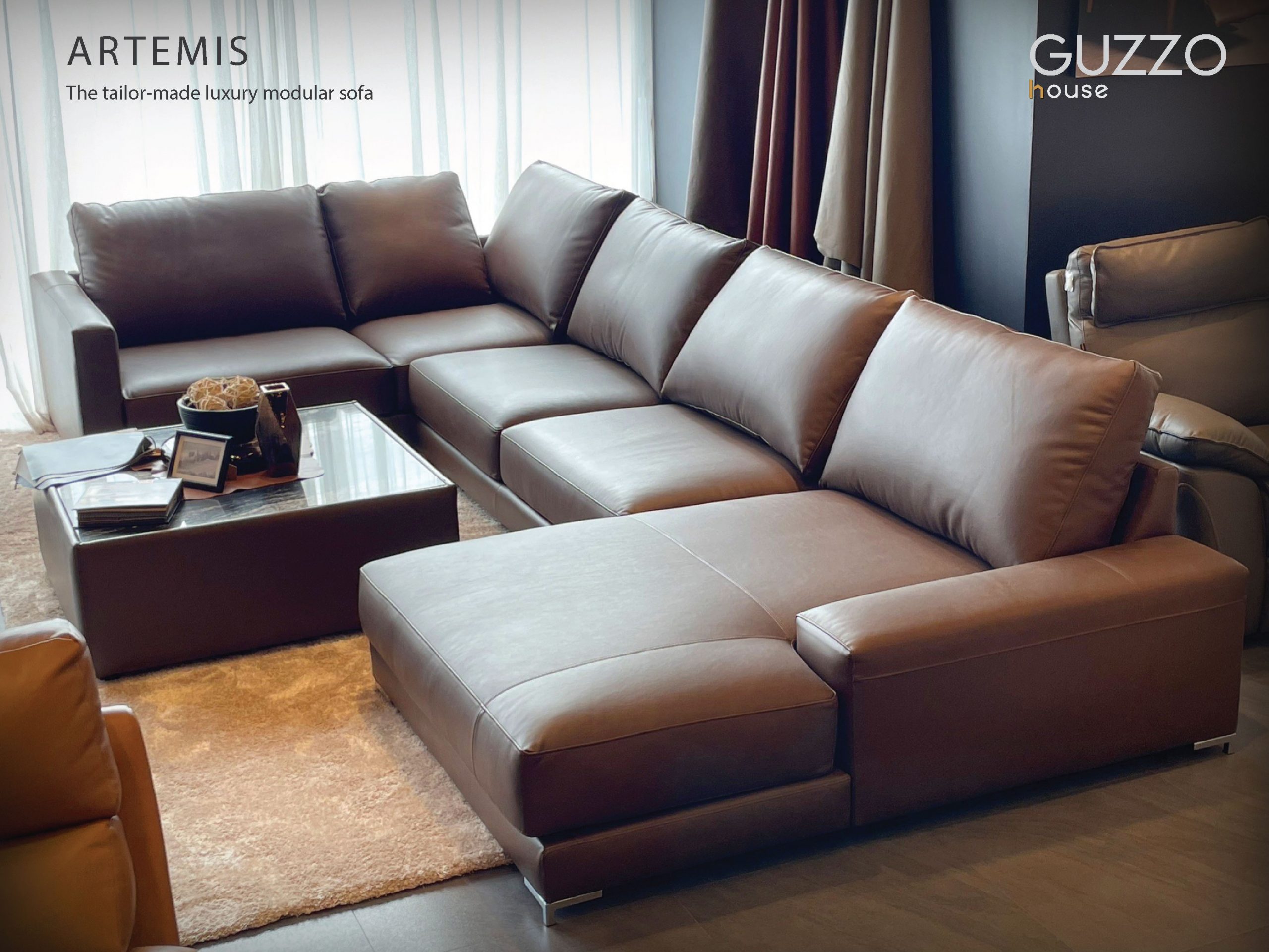 สัมผัสประสบการณ์ใหม่ กับโซฟาที่คุณสามารถเลือกกำหนดขนาดและรูปแบบเองได้ตามต้องการ พิเศษกว่า ด้วยการผลิตและตัดเย็บด้วยงานทำมือ จากผู้เชี่ยวชาญ การตัดเย็บโซฟาหนังแท้ ด้วยประสบการณ์กว่า 15ปี ได้รังสรรค์งานโซฟาทำมือ ด้วยความประณีต และ วัสดุหนังแท้ที่คัดสรรมาอย่างดีทีสุด จนออกมาเป็น โซฟาหนังแท้ จาก GUZZO HOUSE มาพร้อมกับโซฟา ชุดใหญ่ รุ่นใหม่ ARTEMIS ที่มีดีไซน์ Minimal Timeless Design เน้นการลดทอนเส้นสาย ดูสวยไร้กาลเวลา pattern หนังแผ่นเต็ม ลดรอยต่อตะเข็บลง ให้ดูราบเรียบ และ ออกแบบรูปแบบโซฟามาใน ลักษณะ MODULAR DESIGN สามารถลดเพิ่ม หรือ ลด ขนาดจำนวนที่นั่ง, คอนโซล หรือ โต๊ะข้าง ได้ตามต้อง รวมถึงรูป โซฟาไม่ว่าจะเป็นแบบ I-SHAPE, L-SHAPE หรือ U-SHAPE ก็สามารถกำหนดได้